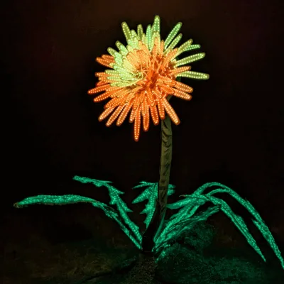 Wish is an illuminated, interactive sculpture of a dandelion in various states of development! Surrounding an upright 6 ft stem, instantly recognizable sawtooth leaves extend out around the base of the piece. This year, the flower is in bloom, with yellow light up petals which close and retract based on the behavior of nearby observers. This allows the audience to become a part of this oversized natural wonder. If, as is our wish, this piece returns in the future, the flower will have gone to seed, and will feature removable light-up seed florets.
